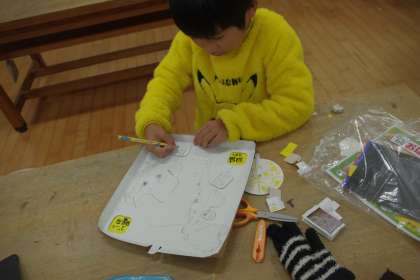 自分で考えたお話をつかったすごろくを作っています。「このマスに入ると、ジャンケンをするんだよ」「地底に入っていく話にしたい」子供たちは、想像を膨らませながら作っていました。