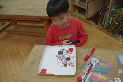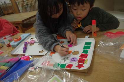 自分で考えたお話をつかったすごろくを作っています。「このマスに入ると、ジャンケンをするんだよ」「地底に入っていく話にしたい」子供たちは、想像を膨らませながら作っていました。