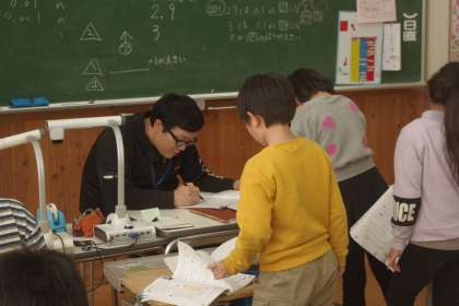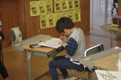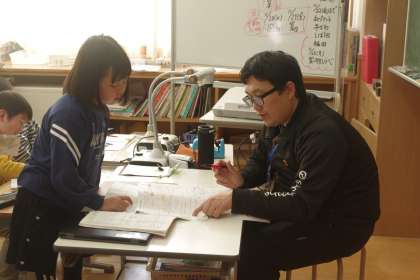 小数の学習に取り組んでいます。問題を解いた子供から、先生に確かめてもらっています。