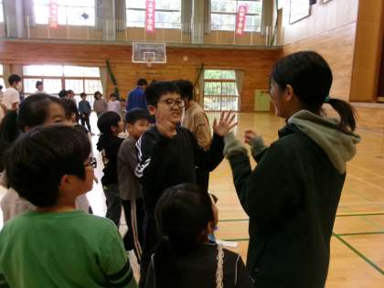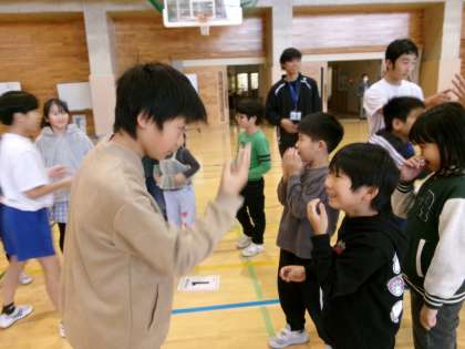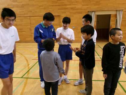 今年度2回目、中学生の企画による小中合同集会を行いました。最初は、言葉を使わずに誕生日順に並ぶゲームです。目と目を合わせてジェスチャーで誕生日を伝え合いながらで多くの人と関わることができました。
