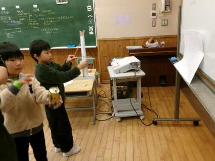 作ったおもちゃの遊び方を考えました。床に目盛りを付けて進んだ長さが分かるようにしたり、的を作って狙えるようにしたり友達同士でアドバイスし合っていました。