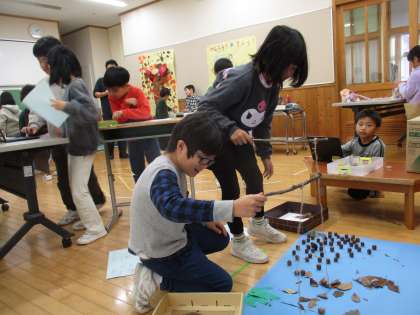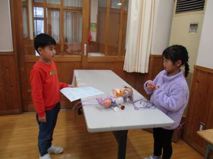 今日は、2・3年生を招待しました。学活や体育等を一緒に学習している2・3年生は、1年生にとって、一番身近で親しみを抱いている上級生です。楽しいおもちゃ遊びを通して、笑顔があふれました。