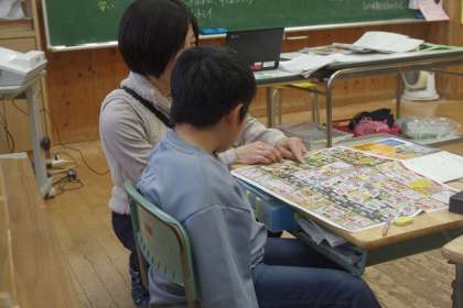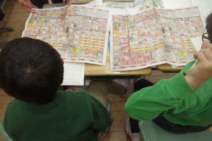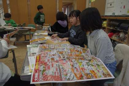 今日は、スーパーマーケットの品物が、どこから来ているのかについて調べました。いろいろなチラシを手がかりにして取り組んでいます。