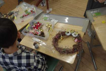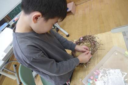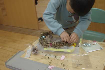 1年生の子供たちが、アサガオの蔓を使ったリースを作っていました。色々な飾りをつけながら、とても素敵なリースができていきます。