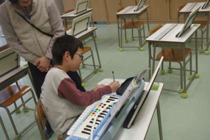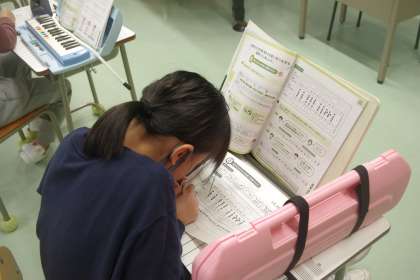 いろいろなリズムを組み合わせて、音楽を作っています。今は、振り返りの時間です。