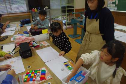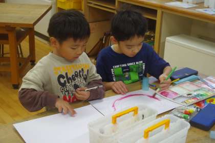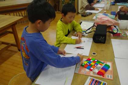 「せんのぼうけん」に取り組んでいます。今日は、友達の冒険とつないで作っていました。