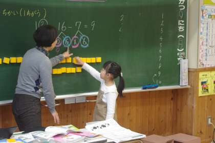 16−7の計算の仕方を考えていました。自分の考えをしっかり説明しています。友達の話を聞くことで、自分も話したいことが出てきます。