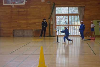 ティーアップベースボールに取り組んでいます。点数が入ると、悲鳴のような歓声が体育館中に響いています。