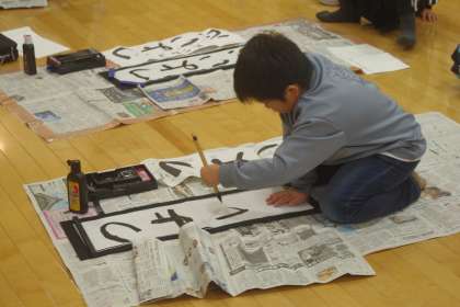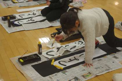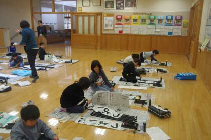 書き初めの練習に取り組んでいます。手本を見て集中しています。