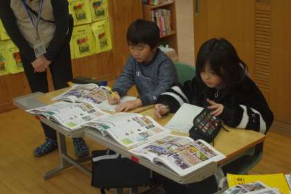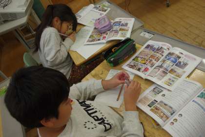 スーパーマーケットのいろいろな役割について確かめています。資料と自分の経験とをつなぎながら考えています。