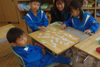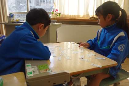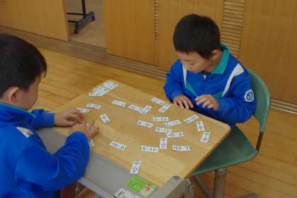 計算カードを使って友達と引き算のゲームをしています。これまで鍛えてきた計算の力が発揮されています。