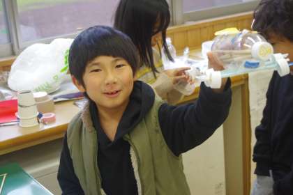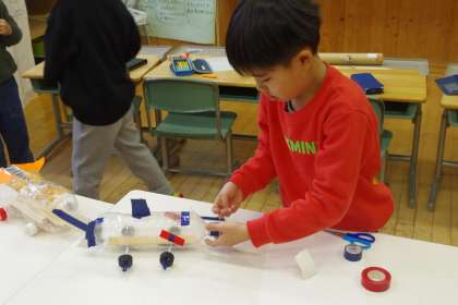 より遠くまで走る車のおもちゃを作ろうと活動しています。「重くした方がいいかな」「タイヤは、どんな風につけたらいいかな」と、試行錯誤しながら取り組んでいます。