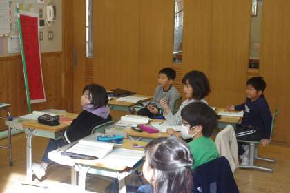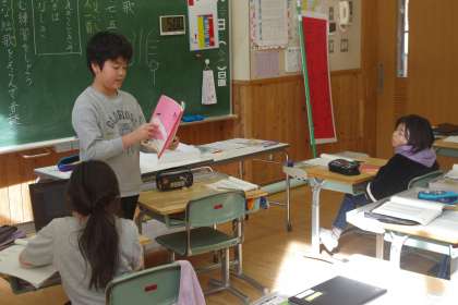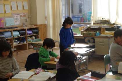 短歌の学習に取り組んでいます。自分のつくった短歌を友達に聞いてもらいました。文字の数を指を折って数えながら聞いています。