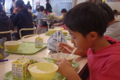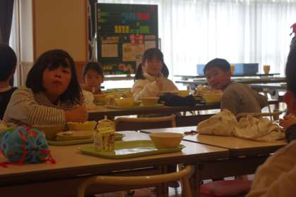今日は、ほうとうが好評でした。「麺が太くて食べてるって感じがする」「スープにかぼちゃの味がしておいしい」と子供たちは、おいしそうに食べていました。