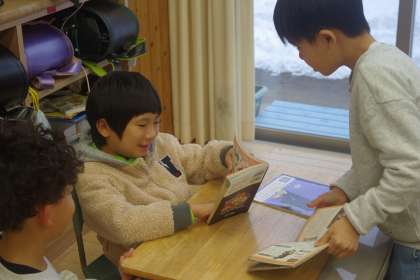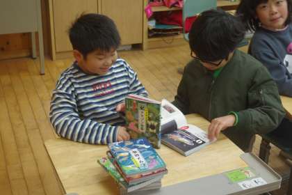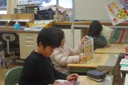 2,3年生も読書に取り組んでいました。友達といっしょに楽しんだり、じっくり自分の読みたい本を読んだりしています。