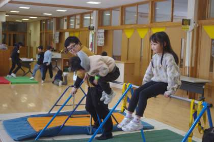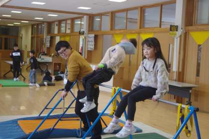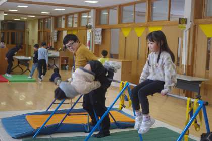 子供たちは、鉄棒やマット運道で楽しんでいます。鉄棒では、上手に回ることができるようになってきました。