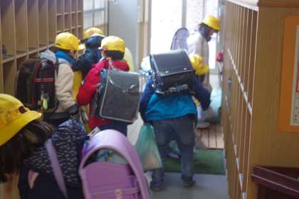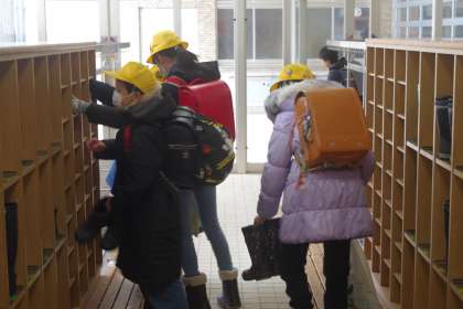 子供たちが帰って行きました。道路には、まだ雪が残っています。いつも以上に気を付けて帰りましょう。