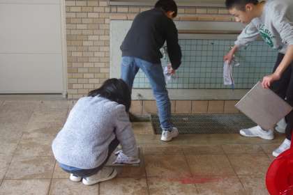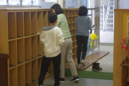 6年生が下足箱を整えていました。中の砂をはらい、下足箱の中を濡れ拭きするなど、いつも以上にきれいにして新しい年を迎えようとしています。