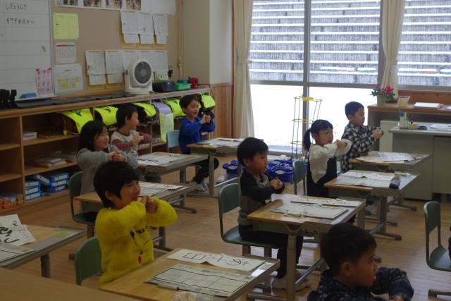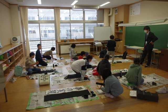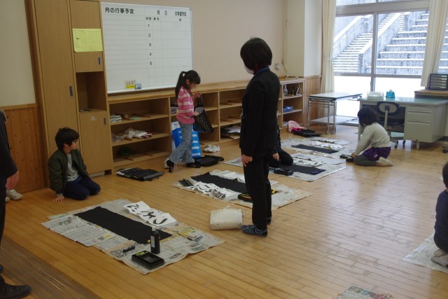書き初めの準備を始める子供たちです。準備がおわると、気持ちを落ち着かせようと軽く体を動かす子供たちもいました。