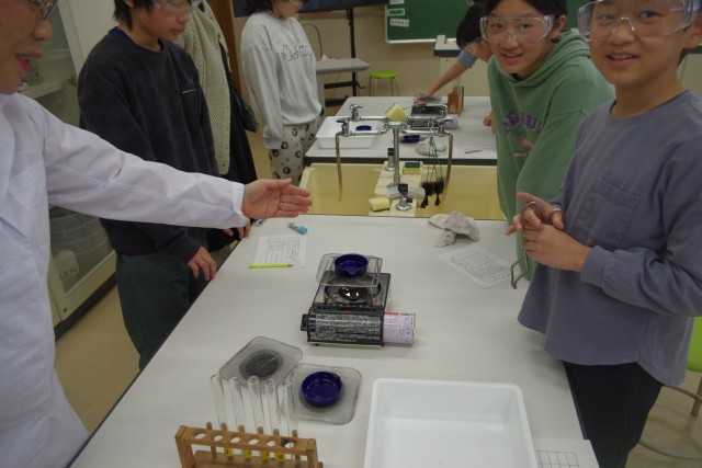 それぞれの試験管の水溶液が何かを調べています。においや蒸発させて残ったものを手がかりに確かめていました。