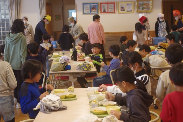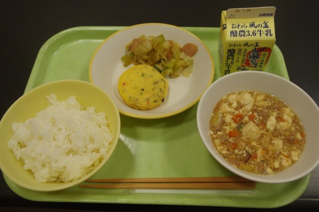 今日の献立は、麻婆豆腐とかに玉、チンゲンサイソテーです。みんなおいしそうに食べています。