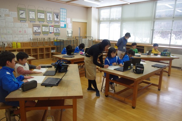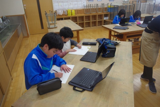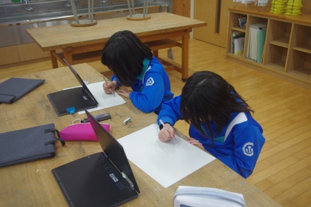 版画の下絵を描いています。どんなデザインにしょうかと考えながら取り組んでいます。