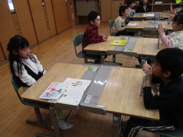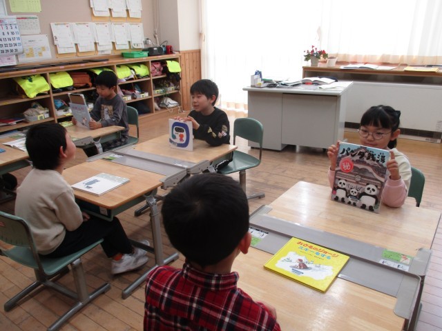「くわしくきこう」の学習では、話し手が好きな本を紹介した後、聞き手が内容や登場人物に関する質問をしました。友達の好きな話について、より詳しく知ることができました。
