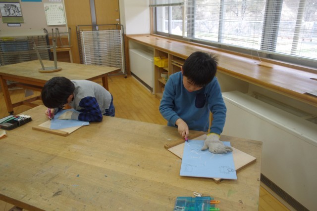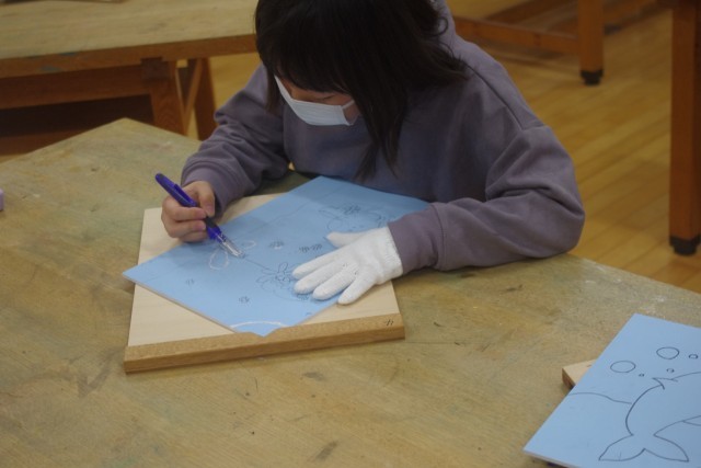 いよいよ彫刻刀を使います。十分に気を付けて作業しましょうね。