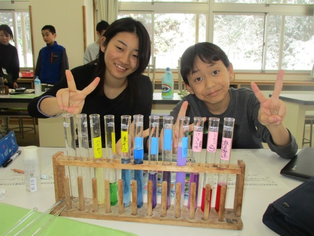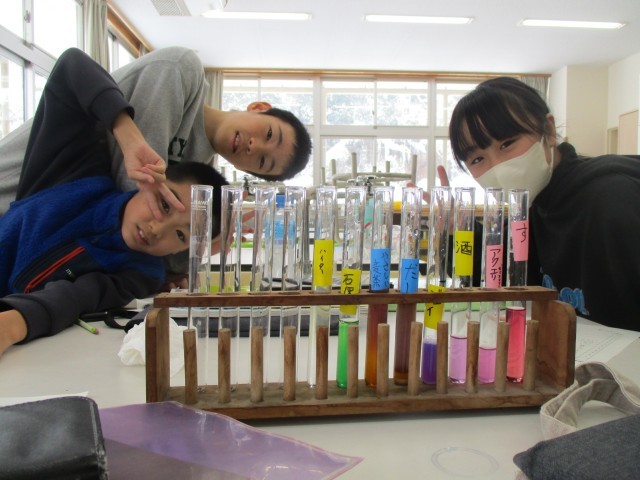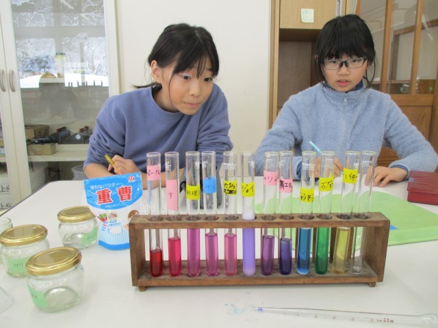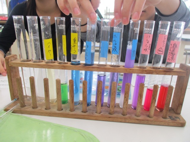 家から持ち寄ったレモン水や化粧水の性質を調べました。酸性、中性、アルカリ性がよく分かりました。