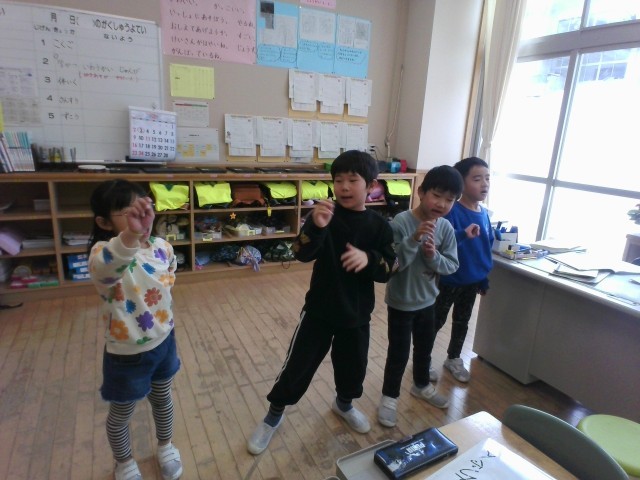 「卒業を祝う会」に向けて、団ごとに6年生のすてきなところを見つけて、伝える練習をしています。