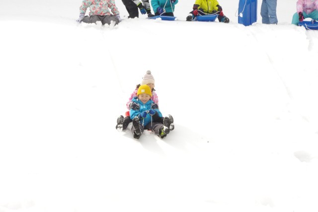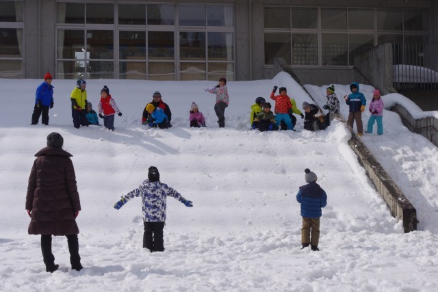 下学年の子供たちが、運動広場で雪遊びをしています。あちこちから歓声が上がっています。