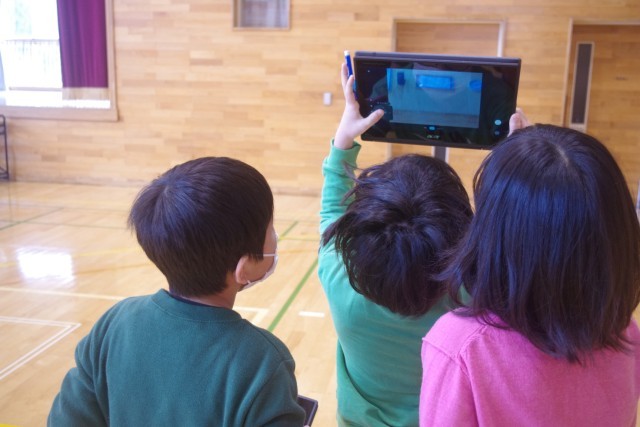 学校の中の好きな場所について紹介する学習に取り組んでいます。スライドを使って紹介するのでしょうか。納得のいく写真を撮ろうとしています。