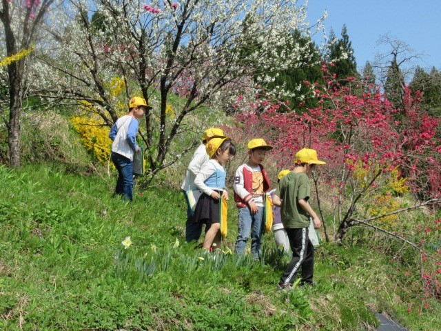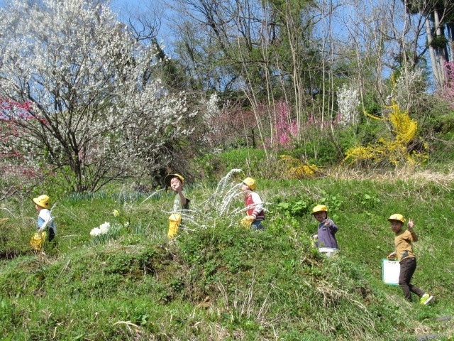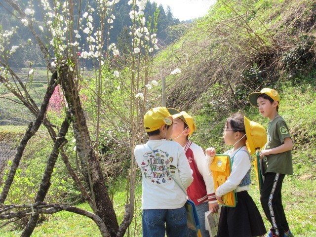 こんな気持ちのよい春の日は、春をみつけに学校前の山の段々畑に出かけたくなりました。ヤマモモの花々が咲き乱れています。一足一足、足元に力を入れて山の階段を上っていきます。2年生の子供たちは楽しそう。ヤマモモの形や色だけでなく、においにまで気付く子供たちの姿がありました。思い思いにみつけた春をカードに描いていました。