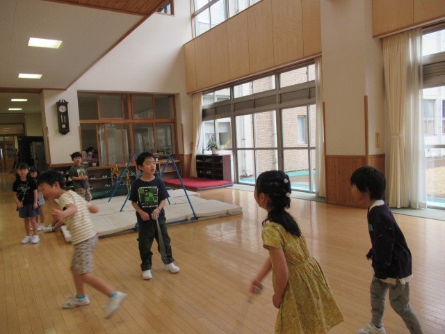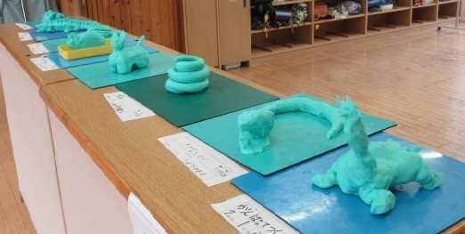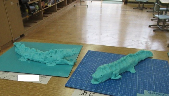 金曜日、フロアには登校後の片付けを終えた2年生が思い思いに活動を楽しんでいました。「ゆうびんや~さん、おはようさん…」と、大繩に親しむ子供たち。そのあとから「8の字跳び」に変わりました。人数が少ないため、すぐに跳ぶ順が回ってきます。上手に跳んでいました。その様子を粘土でつくった作品たちが見守っていました。