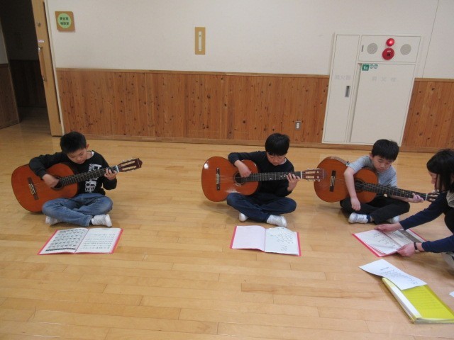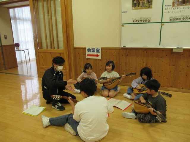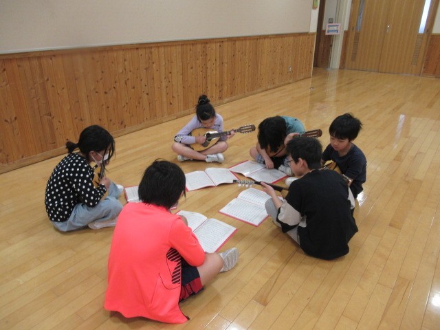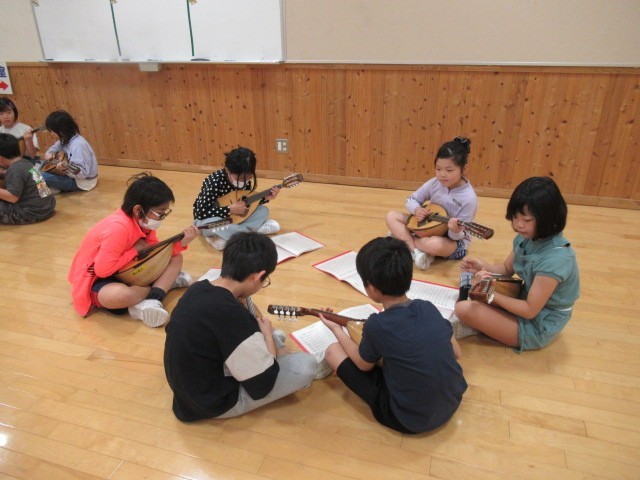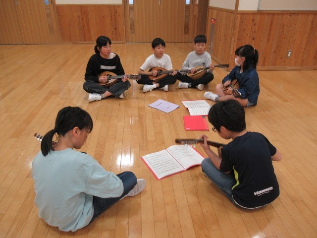 1、2、3年生が校歌を歌ったり、聴いたりしていた時間、2階から軽快なマンドリンのメロディーが流れていました。「勇気100%」の合奏です。4年生以上の子供たちがパートに分かれて演奏し、全体として曲が奏でられていました。小学生のうちからギターやマンドリン、マンドラ、コントラバス等の弦楽器に親しんでいる子供たち、素敵ですね。