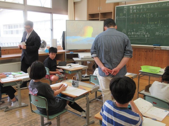 「1億より大きい数を調べよう」の学習について、子供たちは電卓を使いながら楽しく取り組んでいました。今年度最初の学習参観、保護者の皆様がお子さんのそばで応援してくださる様子がたくさん見られました。参観日ならではの特典です。子供たちも安心して学ぶことができました。