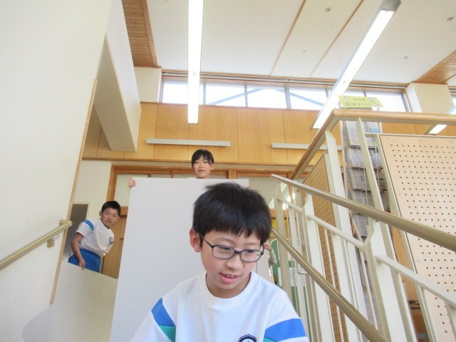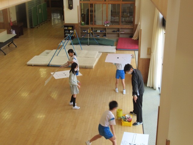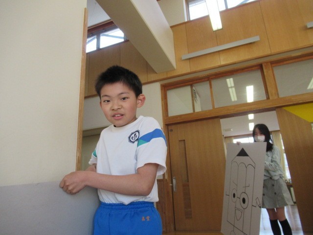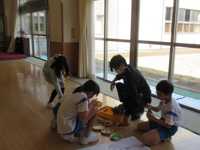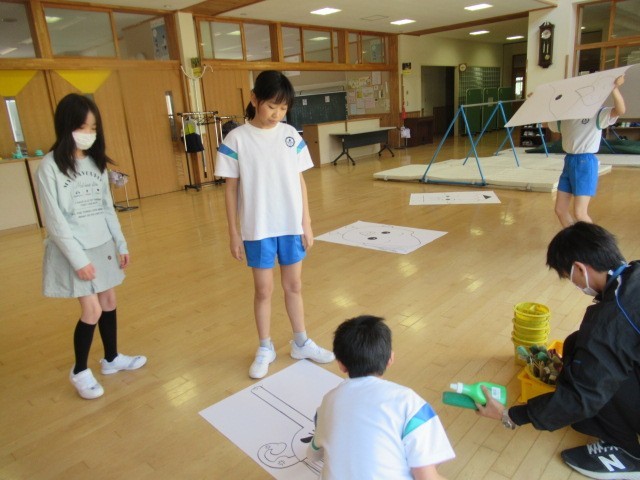 朝の時間、6年生の4人の子供たちは、R7年度児童会マスコットキャラクターの制作に取り組んでいました。拡大した「えんぴつくん」「こめおくん」「てんころシャーク」のマスコットキャラクターをポスターカラーで塗り始める準備中、6年生、ファイト!