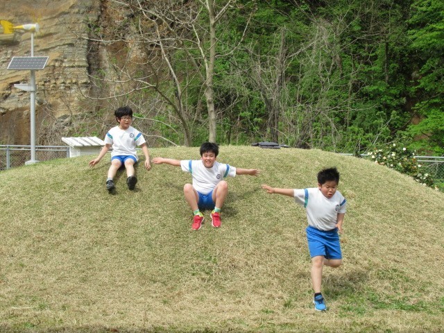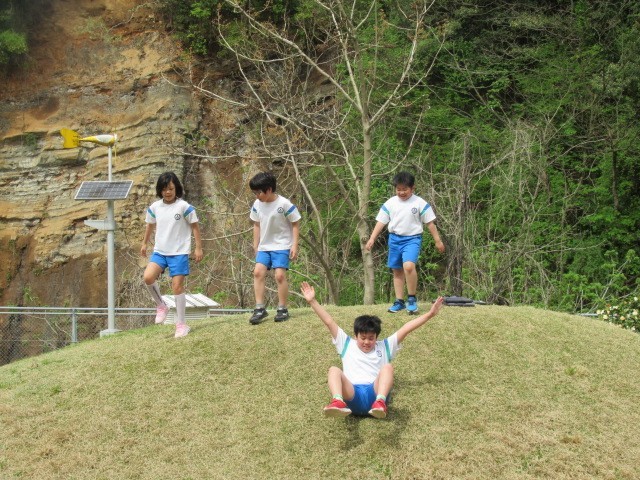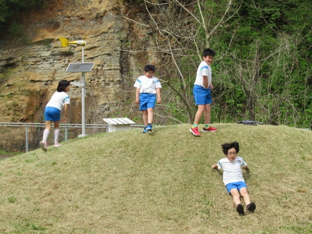 ふと芝生広場の築山に目をやると、楽しそうに子供たちが滑り降りていました。今日も気持ちのよい一日でした。お尻は大丈夫かな…。