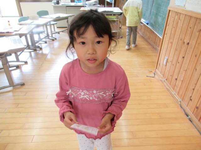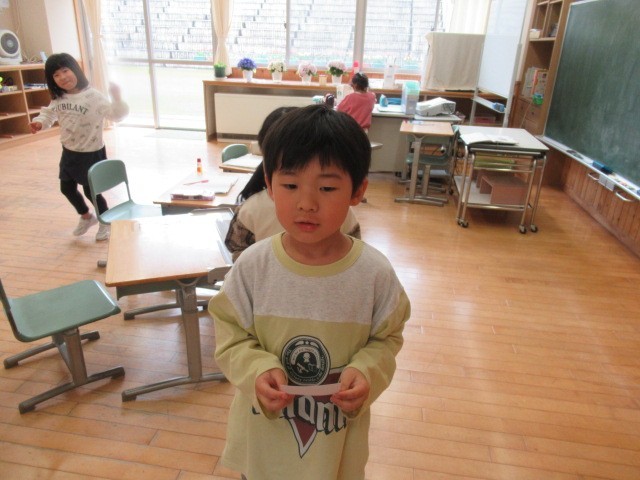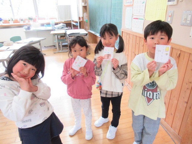 4時間目の終わりごろ、かわいい1年生たちから声をかけられました。そして、出来たばかりの手作りの名刺を頂戴しました。名刺には、学年、名前の他に、ジャンボプリンやシャインマスカット、カラフルな魚たち等、好きなものの絵が描かれていました。とてもうれしかったです。大事にするね。
