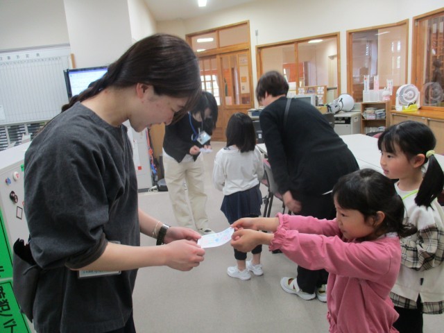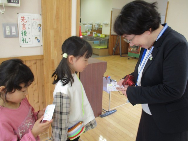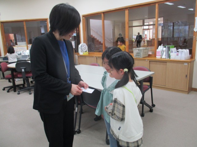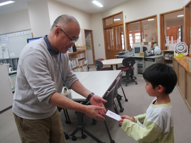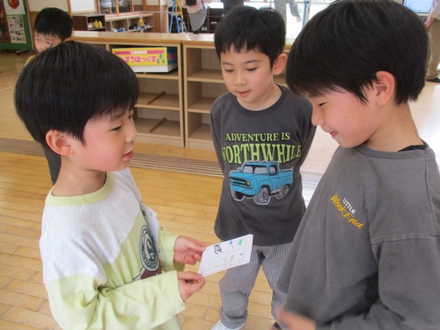 国語科の学習で作った名刺を先生達、上学年に渡しにいきました。自分の名前と好きなものの絵をかいた手作りの名刺を気持ちを込めて渡しました。