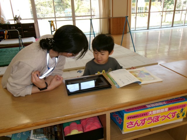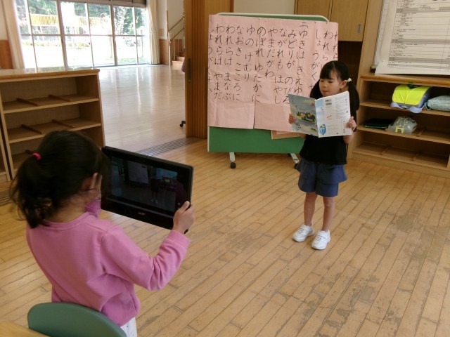 国語科では、「はなのみち」という物語を学習しています。「」の役割を考えたり、自分の音読している様子を動画で撮影したりしました。