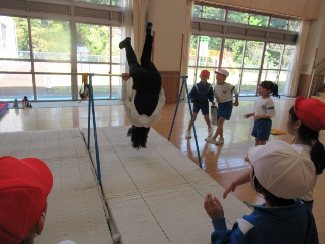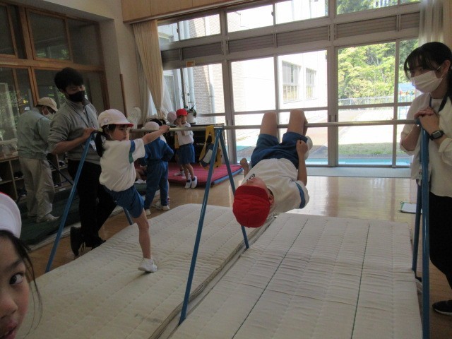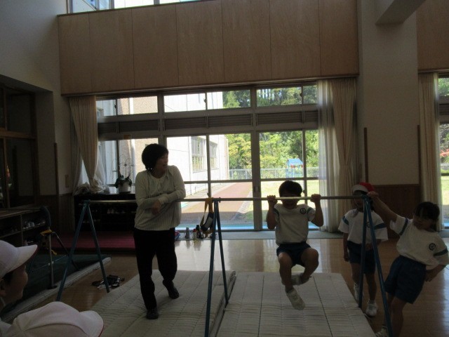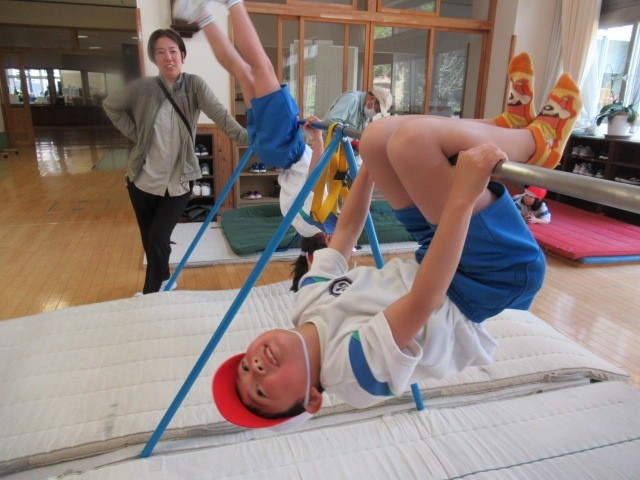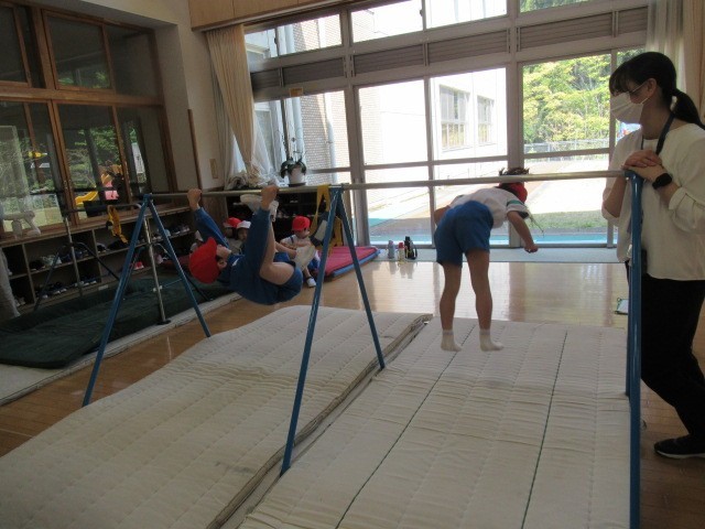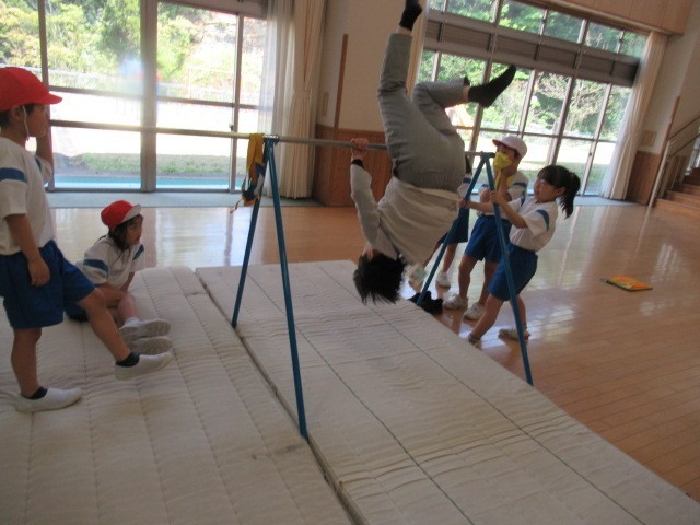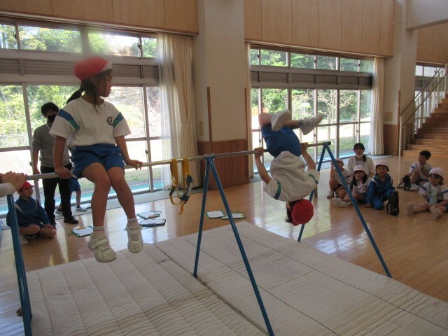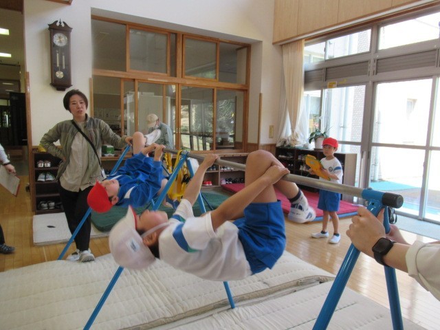 1階のFLSでは、1、2年生の子供たちが鉄棒を頑張っていました。どの子供も、自分のできるようになりたい技を目標に一生懸命練習していました。逆上がり、足抜き回り、地球回り、こうもり振り降り等、いろいろな技に取り組んでいました。今日、足抜き回りができるようになったという子供が、技を披露してくれました。周囲から拍手が起こります。子供たちの可能性は無限です。子供たちのひたむきな姿に、大人もつい…回ってみました。