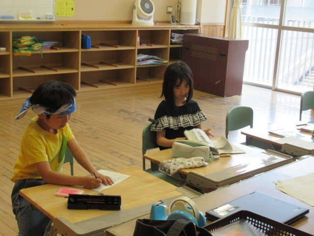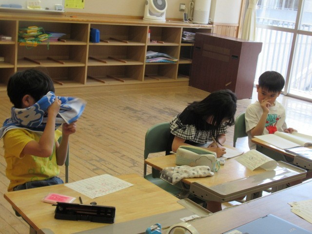 リレーでエキサイトした子供たち、まだその思い冷めやらぬ感じで、ねじり鉢巻きを締めて静かに学習に取り組んでいました。