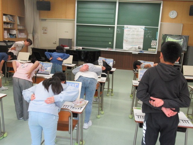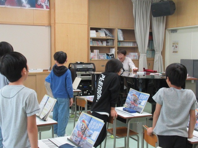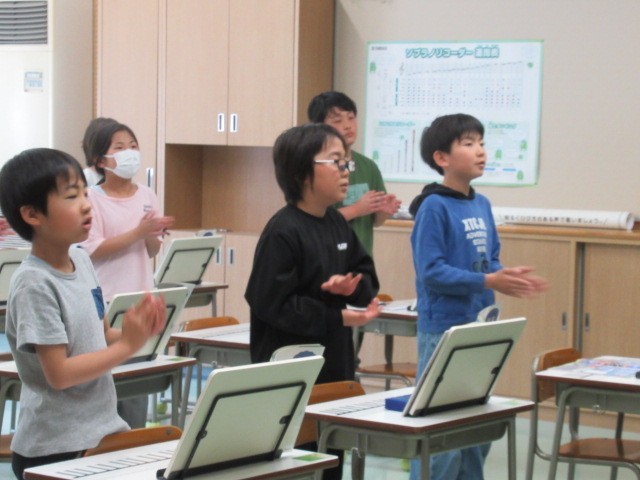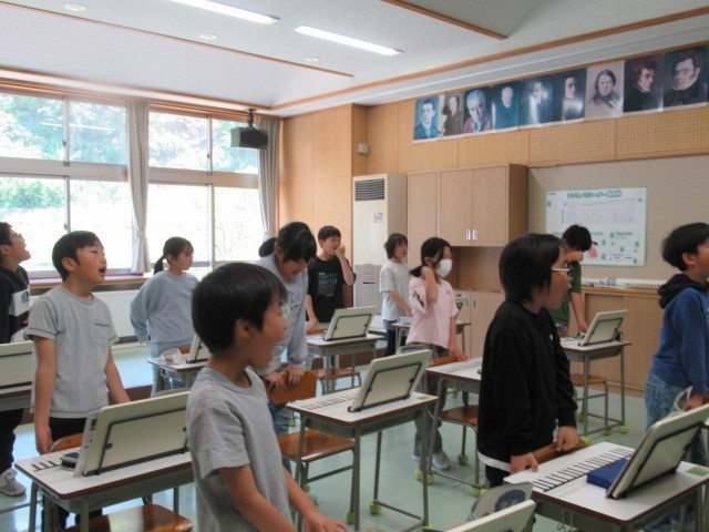 ♪い~ら~か~のなみと、くものなみーと、5年生の子供たちは「こいのぼり」(文部省唱歌)を練習中でした。正しい呼吸法を意識し、楽しい発声練習をした後、手拍子でリズムを感じながら歌いました。