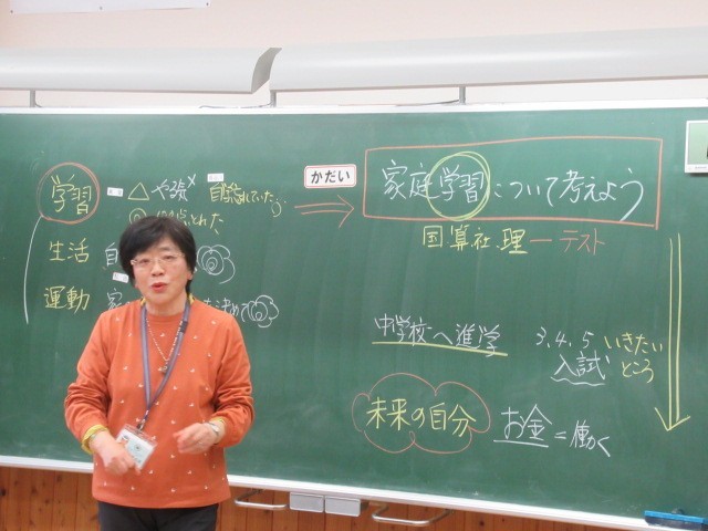 6年生は、自分たちの家庭学習の仕方についてみつめ、今後の自分のための工夫した家庭学習に取り組もうとする話合いをしていました。板書には、中学校へ、高校、大学へ、将来へ…。今がつながっていくことが示されていました。