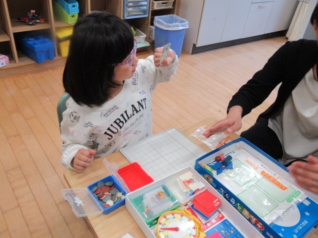 算数セットの中のお金を使って、お店屋さんとお客さんに分かれて、買い物を楽しみました。私は、アイスクリームを買うことができました。