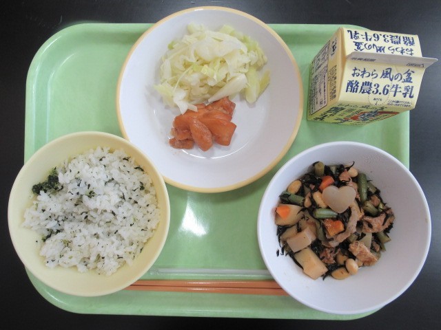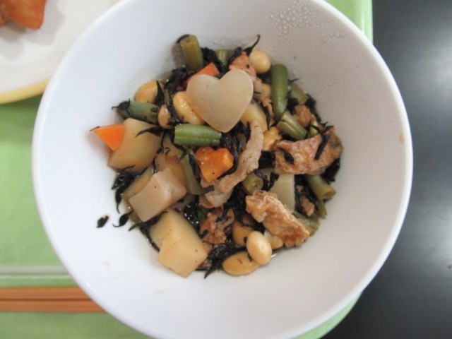 連休明けの給食のメニューは、○鶏肉の照り焼き、○そえ野菜、○大豆の磯煮、○菜めし、○牛乳でした。大豆の磯煮には、細かく刻んだ根菜類がたっぷり入っていて、いい出汁の中、ひじきと絡まって身体にしみわたっていきました。今回はこんにゃくがハート型になっておりました。調理員さんの温かいお気持ちには頭が下がります。子供たちは見つけられたかな?