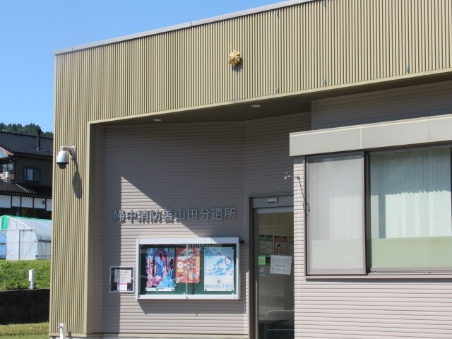 やまだの案山子から夫婦岩パーキングに向かう中に富山市消防局婦中消防署山田分遣所、夫婦岩パーキングを過ぎて山田郵便局、蓮教寺がありました。日常の安心安全を守り、暮らしに欠かせない施設や、歴史のある大きな寺院です。