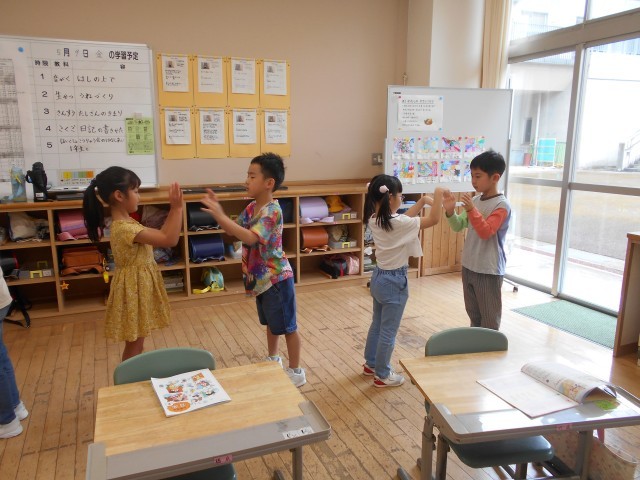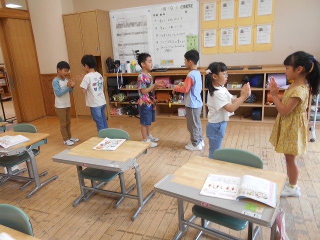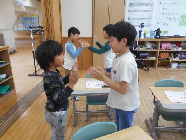 手拍子や足、膝などを使いながら、2拍子のリズムを感じました。