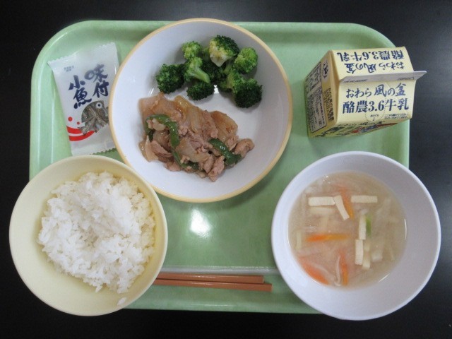 週明けのメニューは、○焼肉、○ゆでブロッコリー、○味噌汁、○味付け小魚、○ご飯、○牛乳でした。焼肉は、生姜が効いていて食欲増進、白ごはんとの相性ばっちりでした。刻みあげ、大根、人参等が入った味噌汁は、優しい味付けでほっこり。今日もおいしくいただきました。